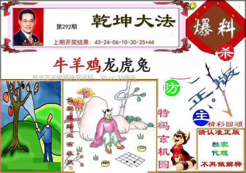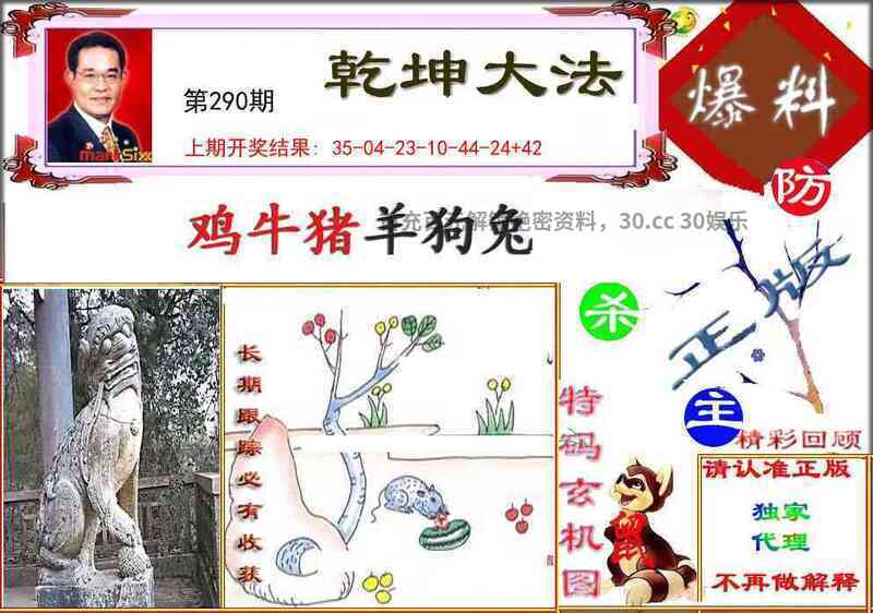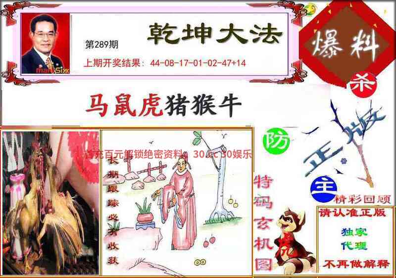 291期:七肖 | 鸡牛马虎猪猴狗 | 开:狗44 |